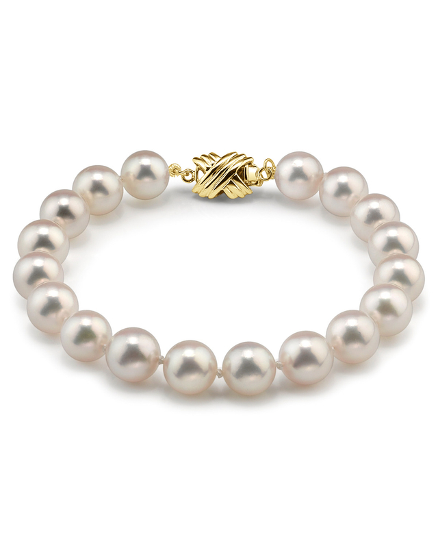Hanadama, meaning 'Flower Pearl,' represents the highest quality available in Japanese Akoya Pearls, certified by the Japan Pearl Science Laboratory. Only approximately 2% of the annual Akoya cultured pearl harvest qualifies for the Hanadama Grade. This beautiful evening bracelet features Akoya pearl that range between 8.5-9.0mm in size and consists of all beautiful and extremely lustrous Hanadama pearls. All pearls in this bracelet are perfectly round and are strung with silk thread and double-knotted between each pearl. This bracelet comes standard with a beautiful 14K gold clasp, though premium clasps can be selected for an additional cost. Known as the 'icon' of cultured pearls, Akoya pearls have graced the necks, ears, fingers, and wrists of women for decades. The Pearl Source imports their Akoya pearls from the saltwaters of Japan, grown in the Pinctada fucata oyster. All of our Akoya pearl bracelets are made on site, and our extensive experience and careful attention to detail allows us to create truly beautiful Akoya pearl bracelets.