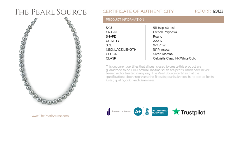 This gorgeous rare silver top quality PSL graded Tahitian South Sea pearl necklace features 9-11.7mm, AAAA quality pearls hand-picked for their radiant luster and overtones.