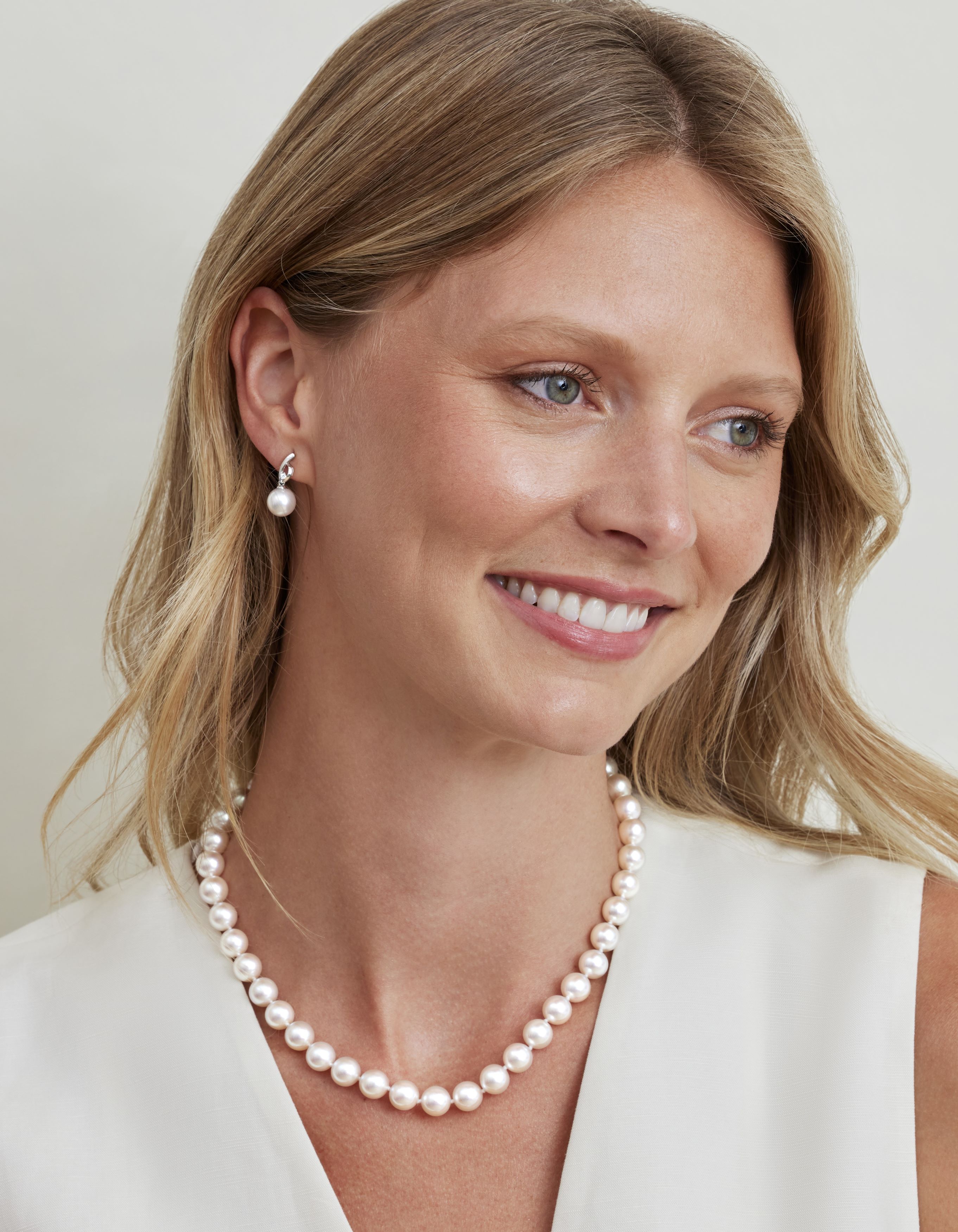 These exquisite pearl earrings feature two 8.5-9.0mm AA+ quality Akoya pearls, hand-picked for their incredible luster and overtones. The pearls are mounted on the finest 14K gold with dazzling SI clarity diamonds.