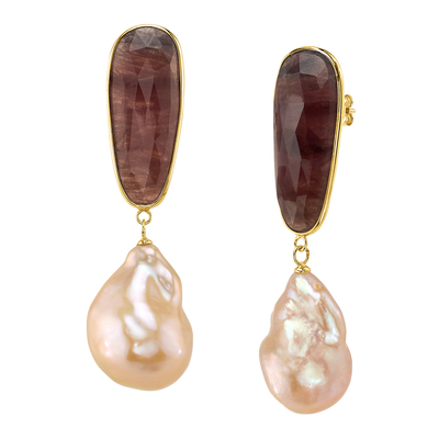 These exquisite pearl earrings add a touch of elegance to any occasion. These earrings feature two lustrous 14-15mm AAA quality baroque peach Freshwater pearls, hand picked for their gorgeous luster. Available in sterling silver and yellow gold plated.