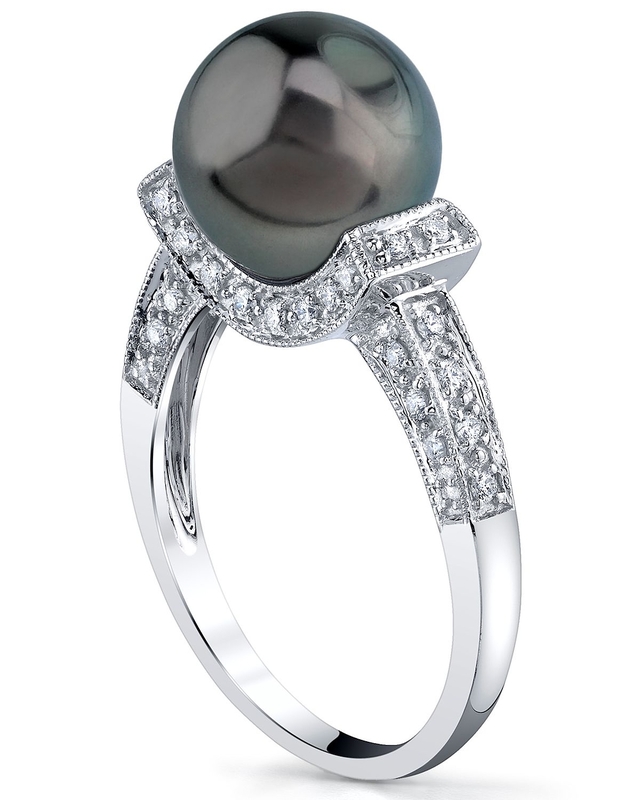 This ring exhibits the beauty of diamonds and pearls. A gorgeous 18K gold ring with a beautiful 10mm Tahitian South Sea pearl with a 'Very High' grade mirror luster. Adorned with 40 diamonds and almost 1/3 carats of SI Quality diamonds, this stunning ring exhibits all the beauty of the South Sea. The ultimate pearl ring at the ultimate price!